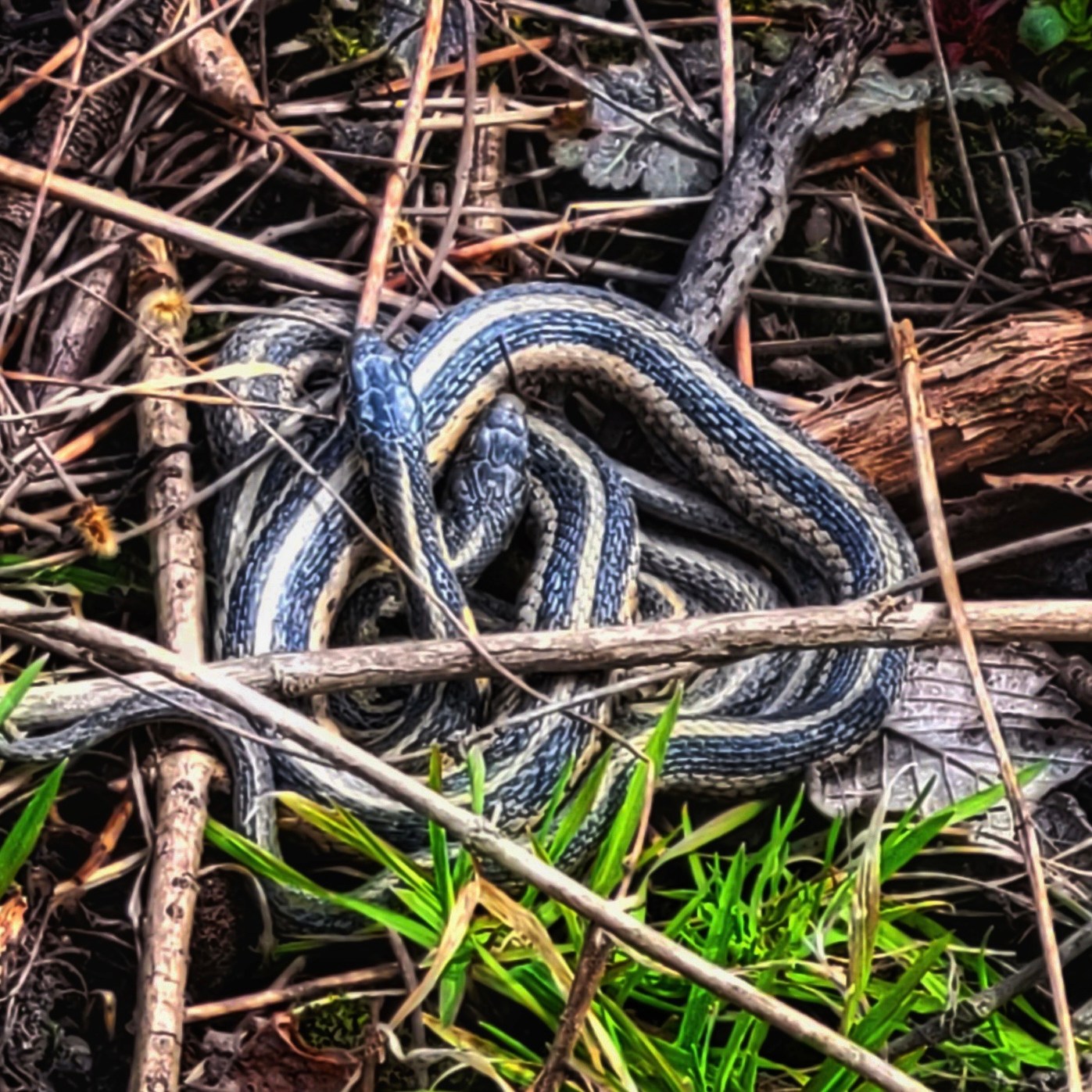 Two common garter snakes (Thamnophis sirtalis) were spotted mating that same month. In April, three painted turtles (Chrysemys picta) sunned themselves on a log. A turkey vulture (Cathartes aura) and a red-tailed hawk (Buteo jamaicensis) soared overhead.